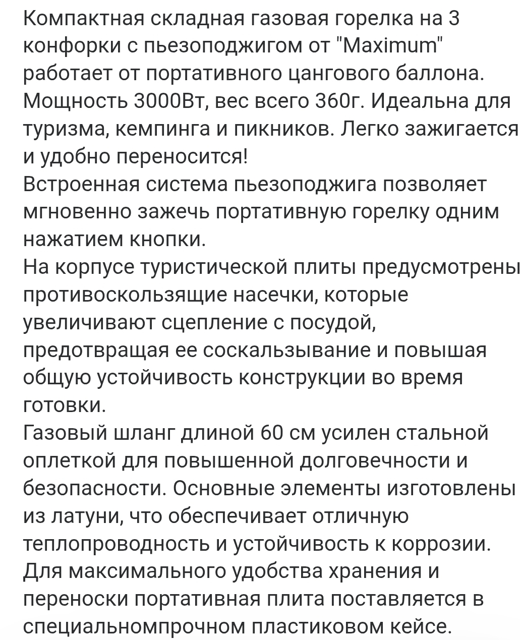 Компактная складная газовая горелка на 3 конфорки с пьезоподжигом от "Maximum" работает от портативного цангового баллона. Мощность 3000Вт, вес всего 360г. Идеальна для туризма, кемпинга и пикников. Легко зажигается и удобно переносится!