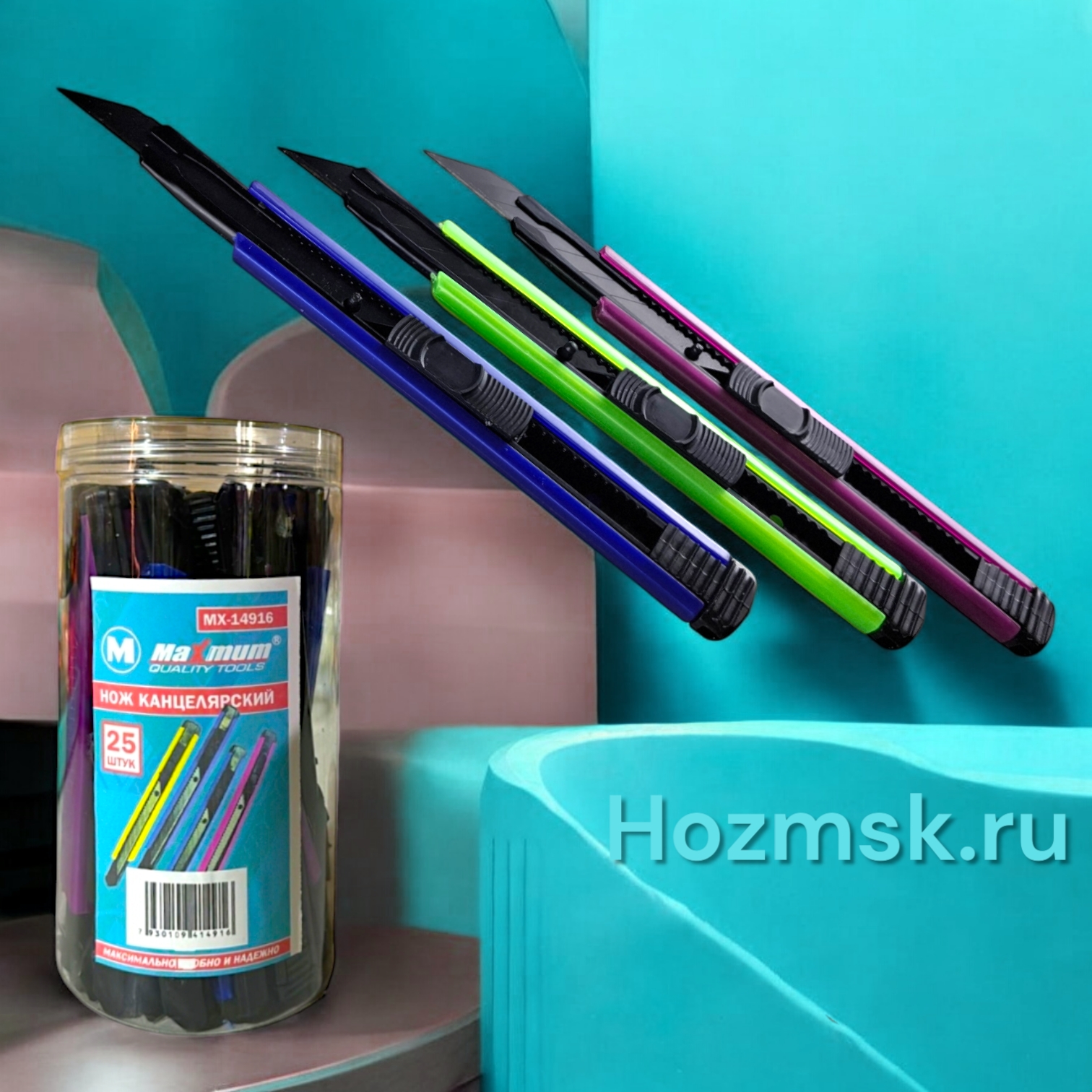 Нож канцелярский с фиксатором и металлической направляющей оборудован сегментированным лезвием 11× 85 мм и поставляется в различных цветах. Канцелярские ножи длиной 145 мм поставляются по 25 шт. в пластиковом боксе от "Maximum Quality Tools" и предназначены для резки бумаги, картона, ткани и пластика. Ребристый пластиковый корпус надежно лежит в руке и не скользит. Отламывающиеся сегментированные стальные лезвия не боятся коррозии и имеют качественную заводскую заточку. Система фиксации лезвия push-lock и насадка для безопасного отделения сегмента лезвия делают работу безопасной.