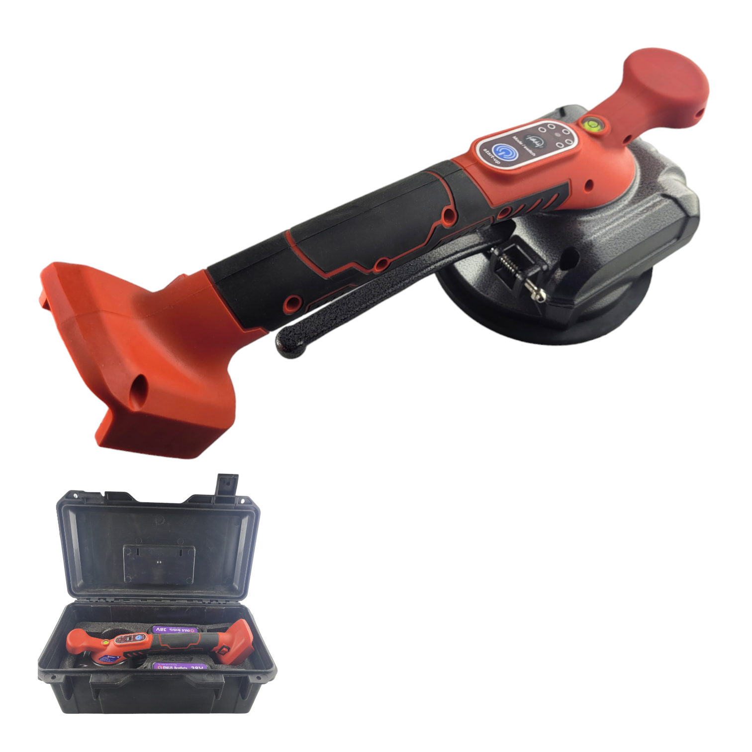 Виброприсоска для укладки и осаживания плитки поставляется в комплекте с 2-мя литиевыми аккумуляторами на 38 V. Это устройство 2 в 1: присоска и минивибратор. Поглощающая способность 100 кг. Мощная резиновая присоска диаметром 125 мм разработана для перемещения и подъёма плитки даже с небольшой шероховатой поверхностью или рельефом.