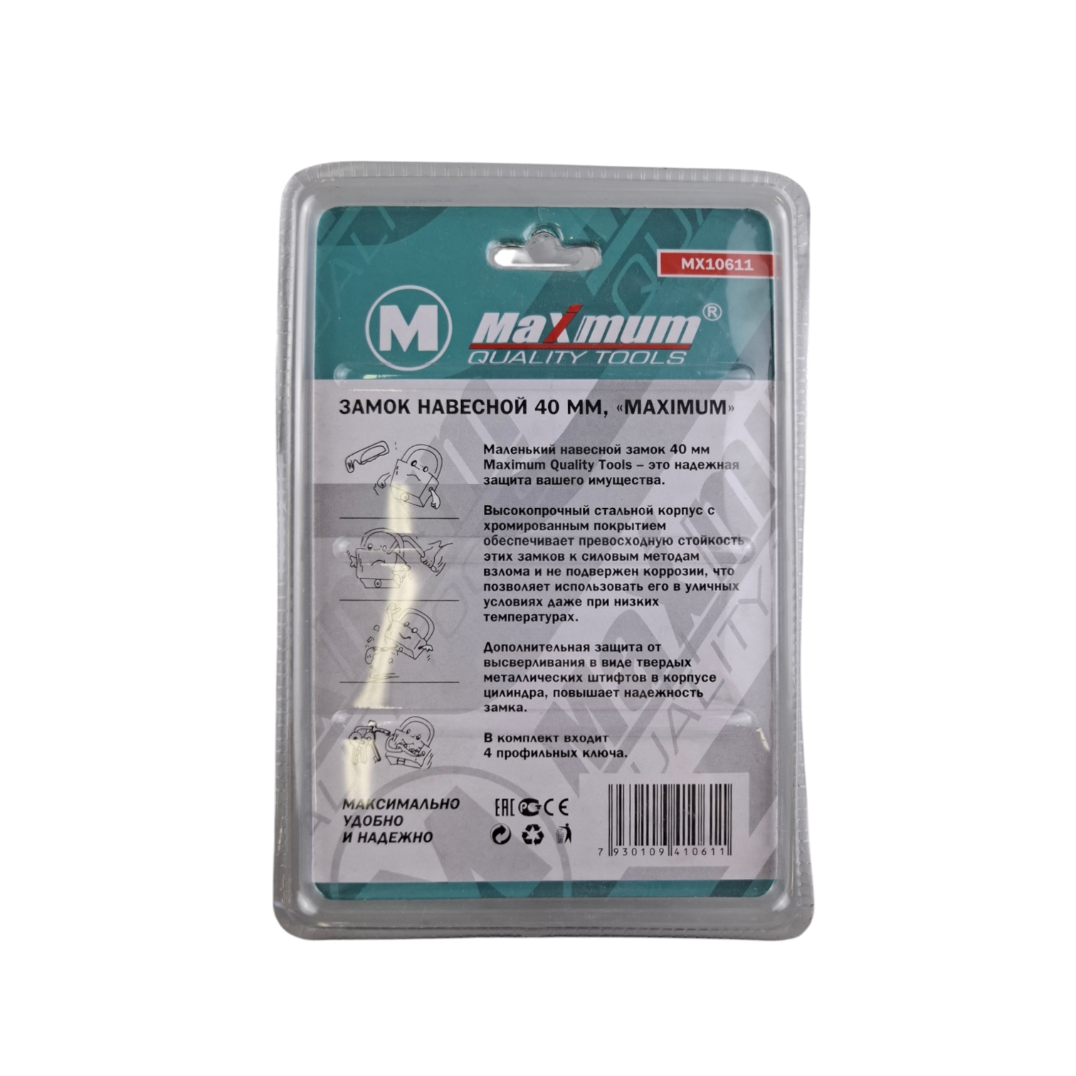 Маленький навесной замок 40 мм Maximum Quality Tools – это надежная защита вашего имущества. Высокопрочный стальной корпус с хромированным покрытием обеспечивает превосходную стойкость этих замков к силовым методам взлома и не подвержен коррозии, что позволяет использовать его в уличных условиях даже при низких температурах.